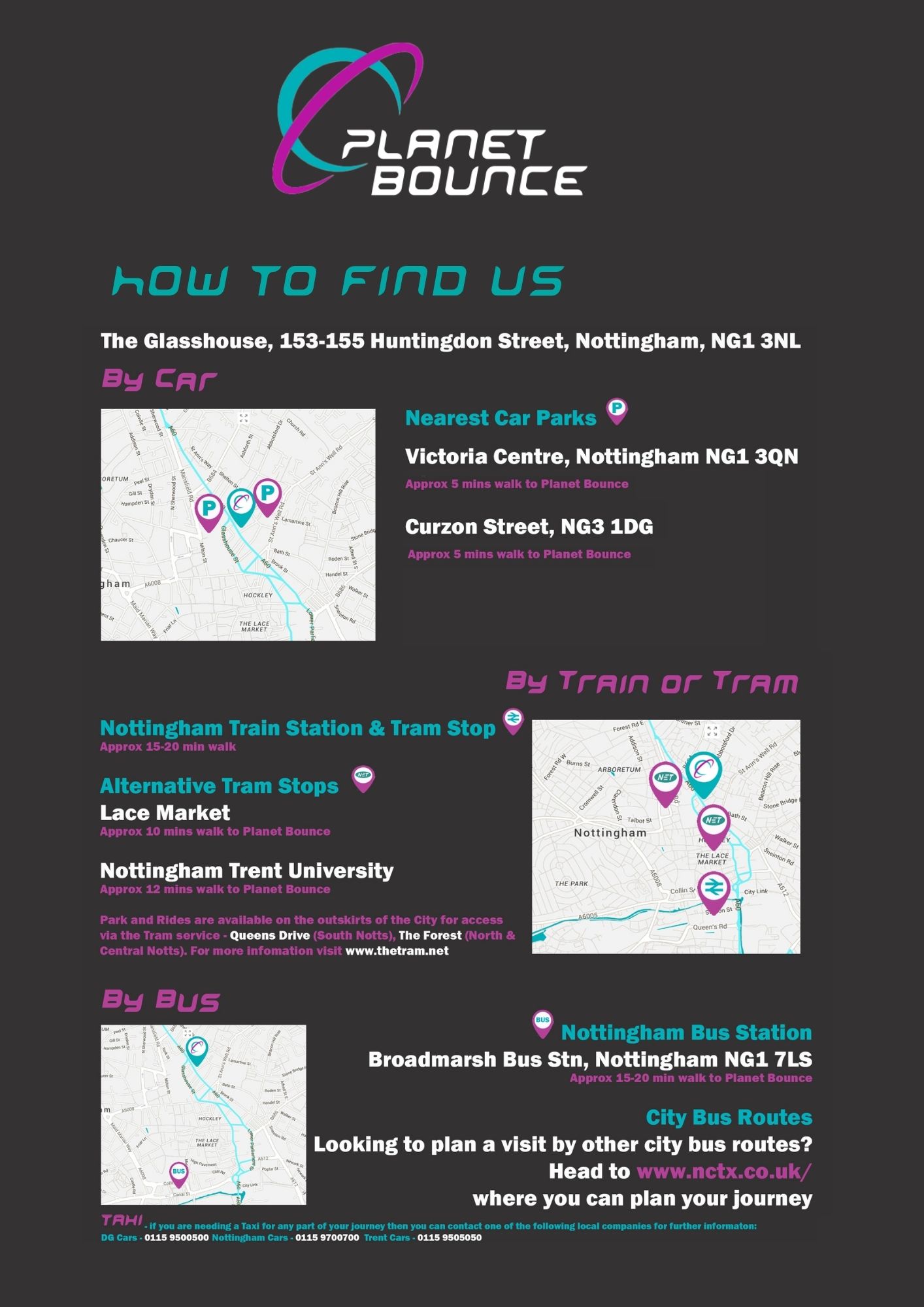 Planet Bounce is located in Nottingham town centre at The Glasshouse, 153-155 Huntingdon Street, Nottingham NG1 3NL. Click here for travel details.